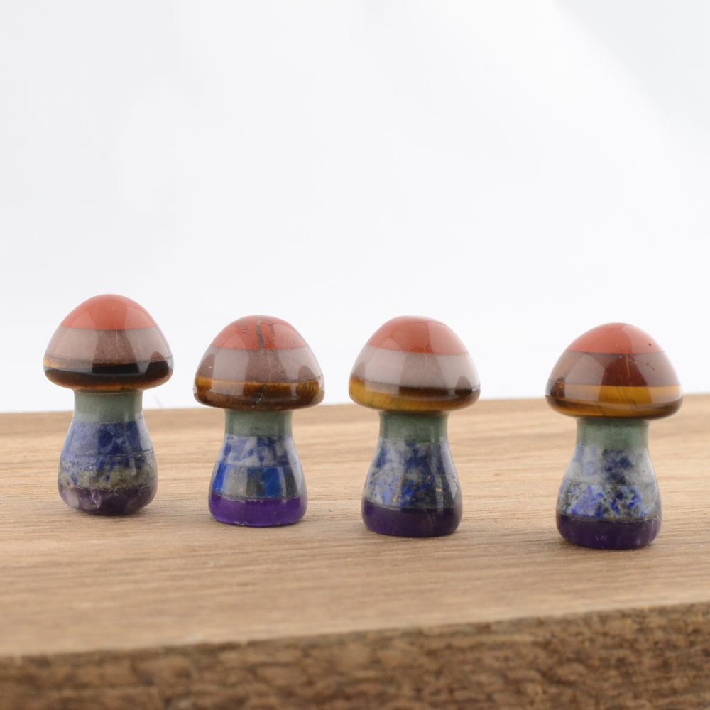 Each mushroom is formed from a combination of stones traditionally associated with the chakra system. The stem is banded with cut sections of amethyst, lapis lazuli, green aventurine, tiger’s eye and jade, with a red jasper cap forming the top.