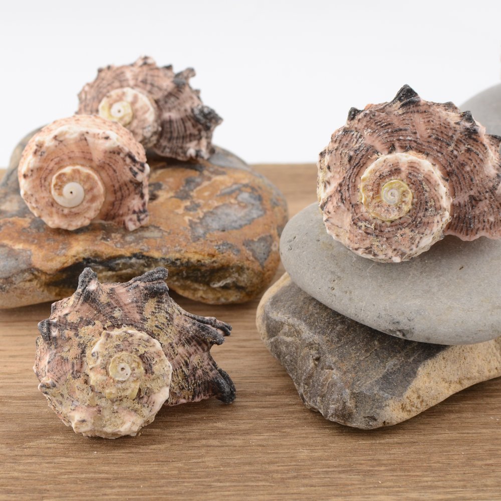 Recognisable for its sculptural, spined form and spiral structure, this species has a strong, architectural appearance. Colouring typically ranges from creamy white through to pale pinks and soft browns, often with subtle banding.